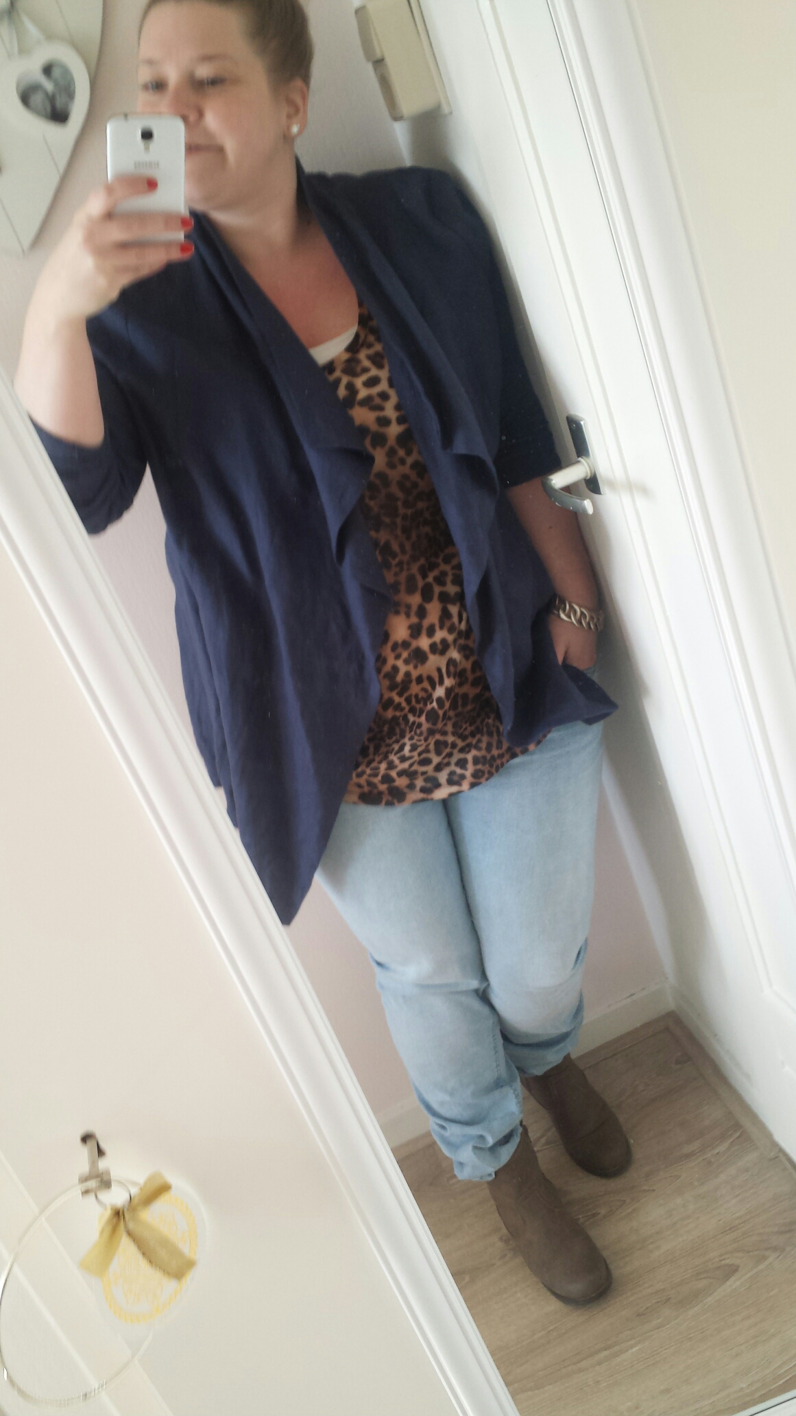 Broek: Light denim / Bonprix, Top: leopard print / H&M, Blazer: navy blue / Promiss, Shoes: enkellaarsjes / Bristol
