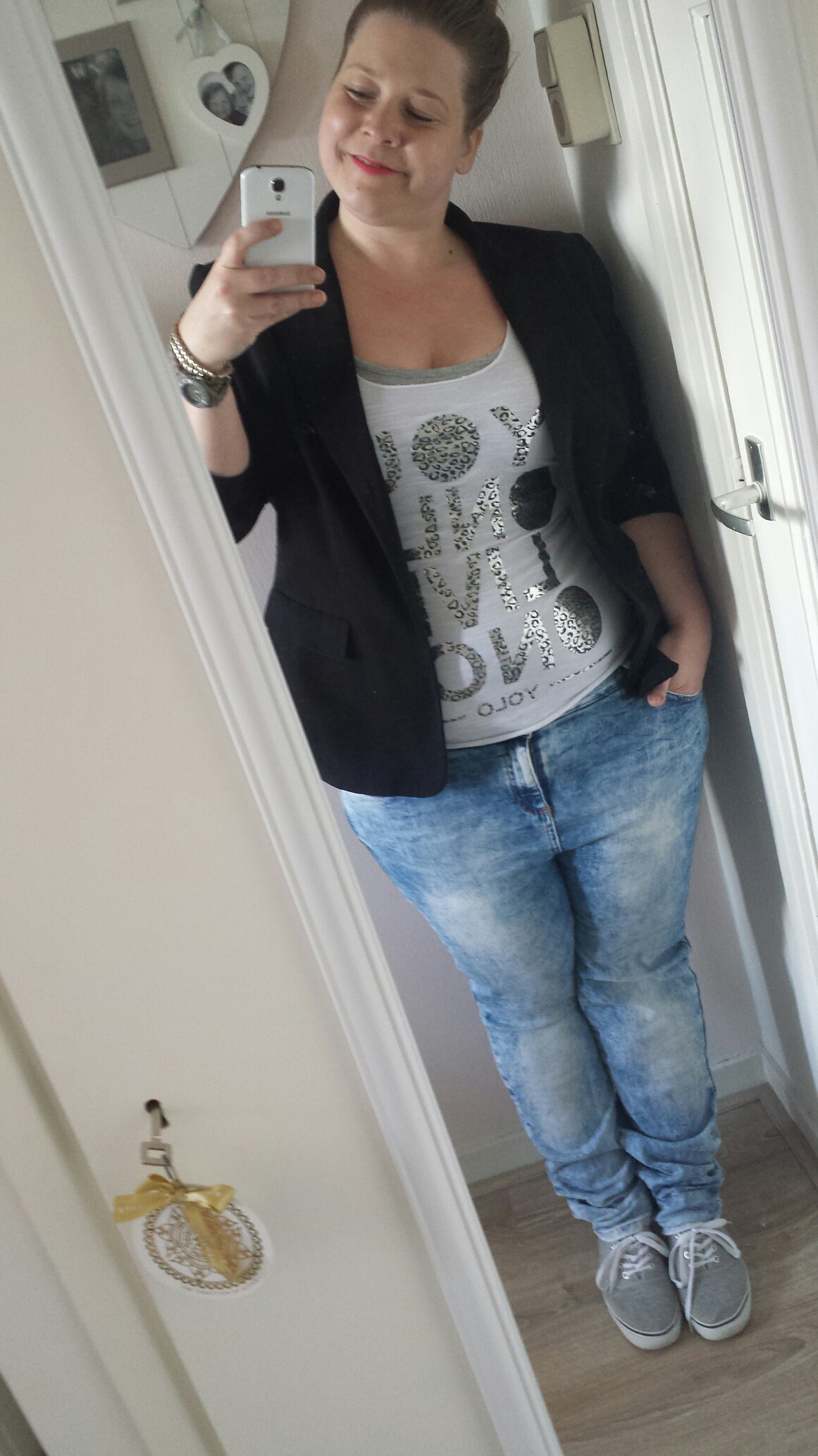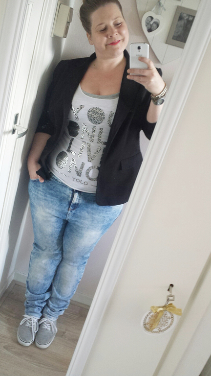 Broek: Baggy washed denim / Promiss, Top: “You only live once / V&D, Soho, Blazer: C&A, Shoes: Sneakers / Primark
