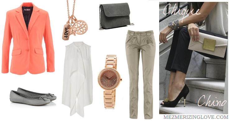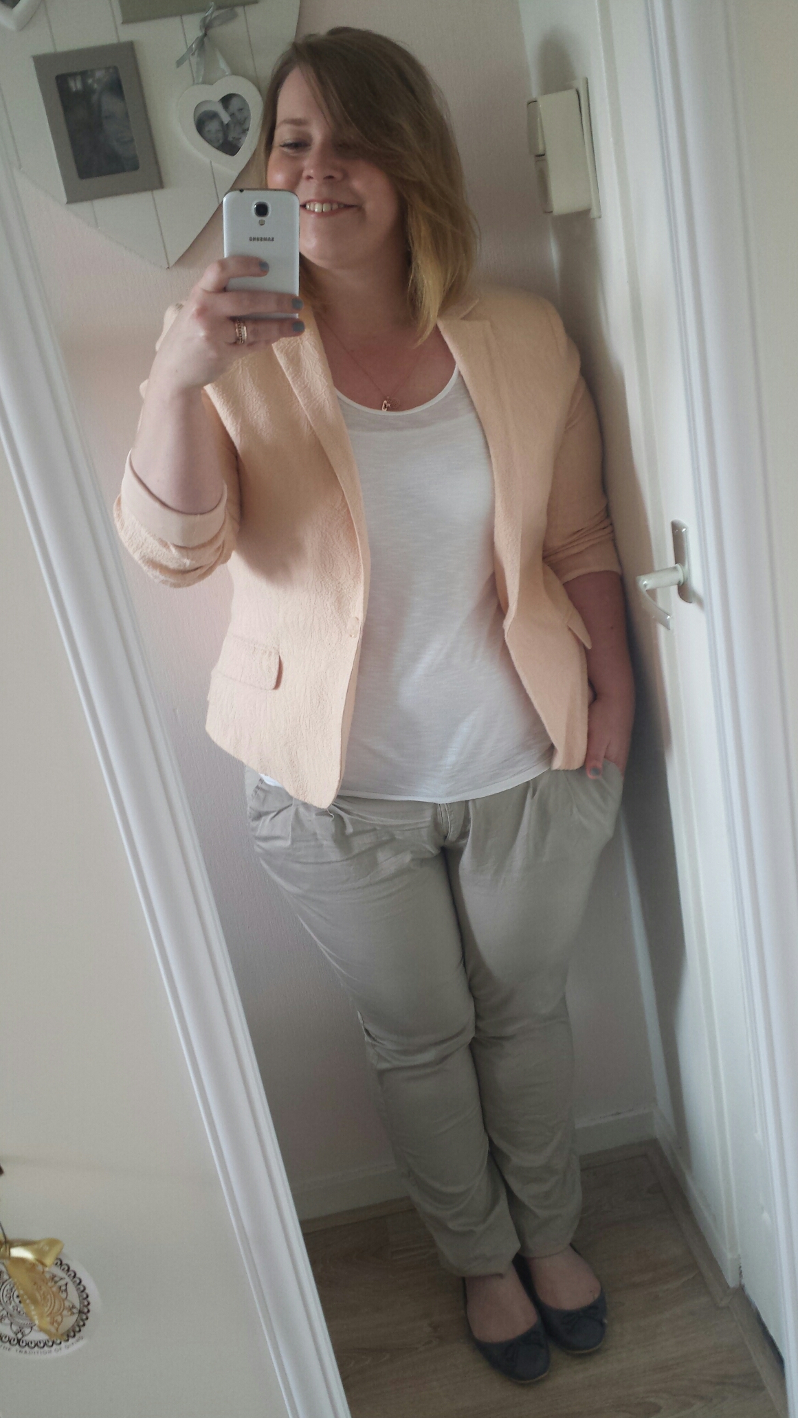 Broek: Chino, BPC by Bonprix | Top: wit t shirt, Esprit | Blazer: Zalmkleurig, Stepps | Shoes: Grijze ballerina’s, Nelsons