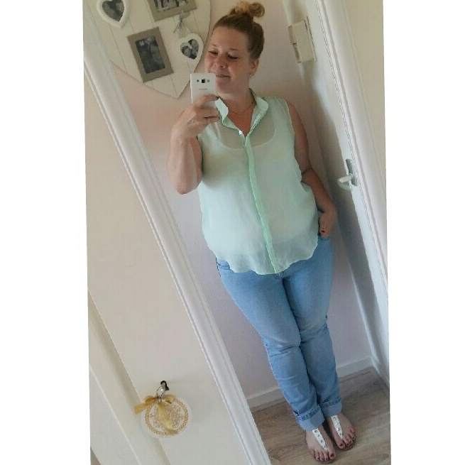 Lichte jeans: Bonprix | Mint groene blouse: Hema | Wit hempje: H&M | Sandalen: Zalando | Oorbellen: Mint en goud van de Hema